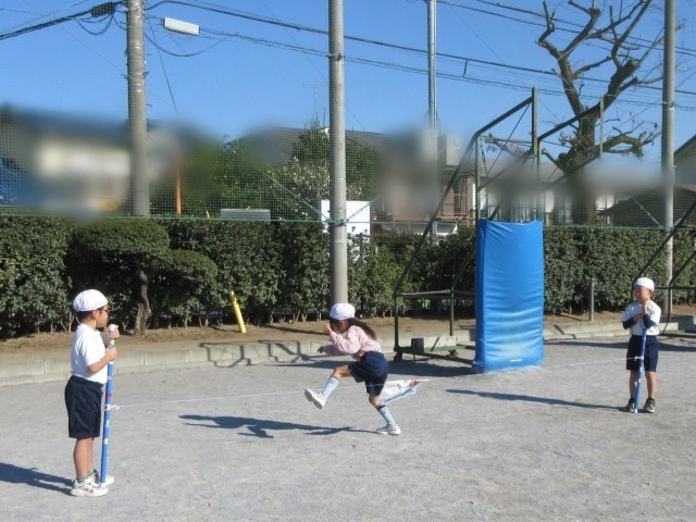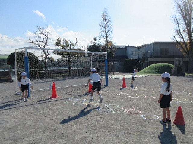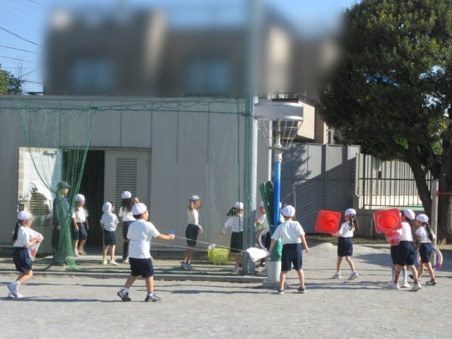 ゴム跳びをしたり、ケンステップを使ってリズムよく跳んだりしていました。順番を守って楽しく活動しています。活動が終わると、先生の指示で片付けをします。蜘蛛の子を散らすように使った道具を手に取り、あっという間に片付けが終了です。その素早さにほっこり…感心しました。