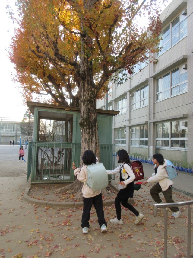放課後です。風に舞う落ち葉を、子供たちが楽しそうに帽子に集めていました。