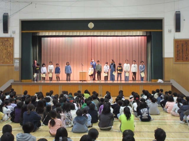 クラス代表の児童と入選作品の表彰を行いました。夏休みに読んだ本について、一生懸命に書いた思いが評価されたことに、全校児童から大きな拍手が送られました。