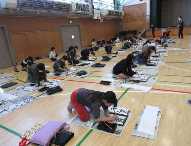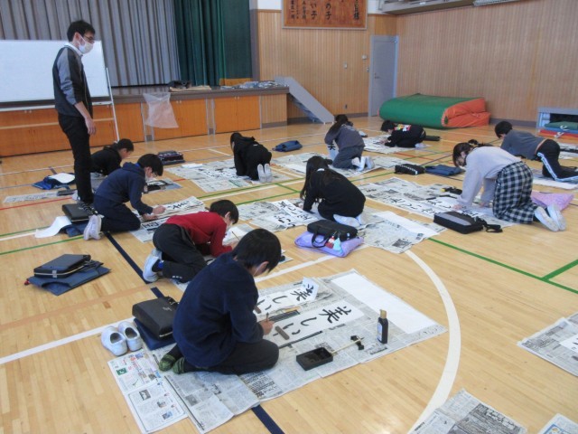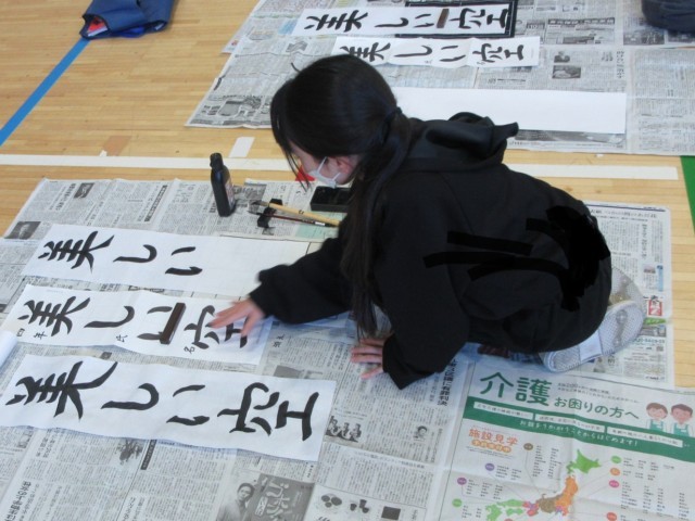 「美しい空」と、4文字を文字のバランスに気を付けて書いています。お手本を指でなぞったり、自分が書いたものをお手本と見比べながら、丁寧に取り組んでいました。