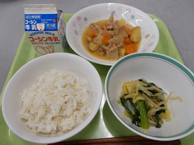 じゃがいもの芽には「ソラニン」という成分があって、この芽の部分を食べるとお腹が痛くなったりします。でも給食では、調理さんがいつも丁寧にじゃがいもの芽を取って作っています。小学生が大好きなじゃが芋をみそ煮にしてたくさんいただきました。