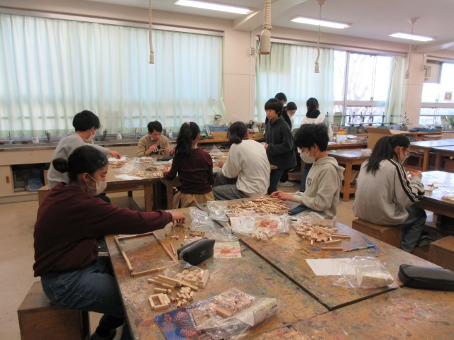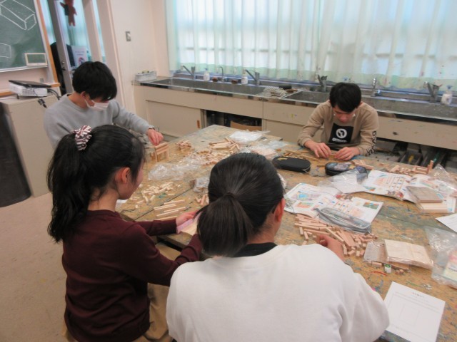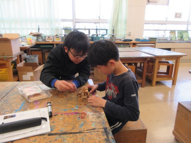 異なる色、異なる大きさの木片を組み合わせて、そこから生まれる立体工作に取り組んでいます。まるで箱根の寄木細工のよう…。担任の先生も、子供たちの中に入って楽しんでいました。
