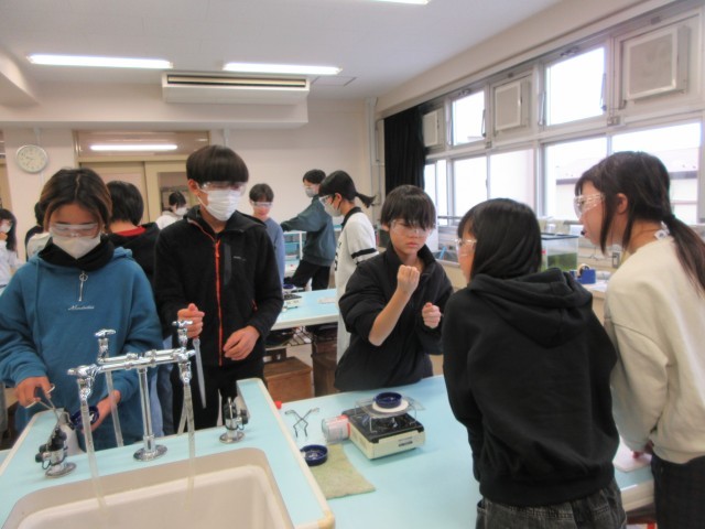 6年2組は、理科室で実験をしていました。単元は「水溶液の性質とはたらき」です。5種類の水溶液(食塩水、石灰水、アンモニア水、塩酸、炭酸水)を蒸発させるとどうなるのかを実験して調べています。子供たちは、火や水溶液の取り扱いに注意して実験に取り組み、蒸発する様子や蒸発した後の様子などを観察していました。目を保護するためのメガネが、表情までキリリとさせているようでした。