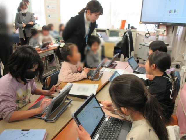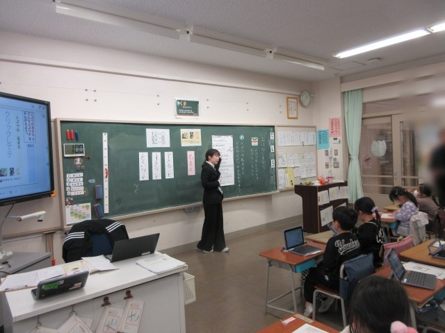 楽しそうに学び合う1年生の姿に、参観した先生たちの表情が緩んでいました。