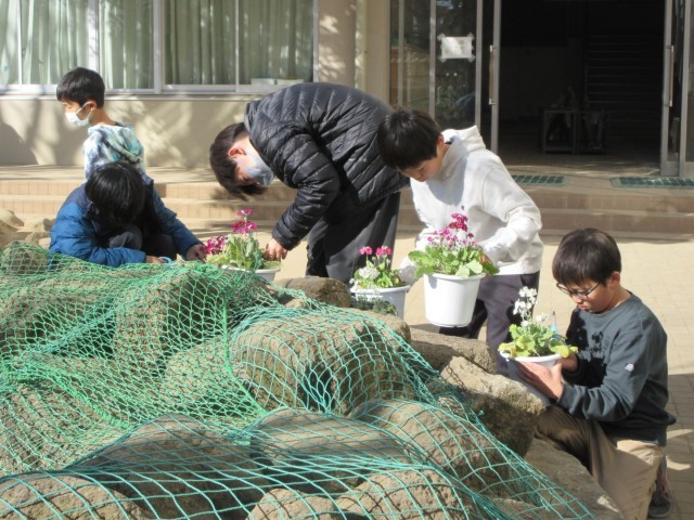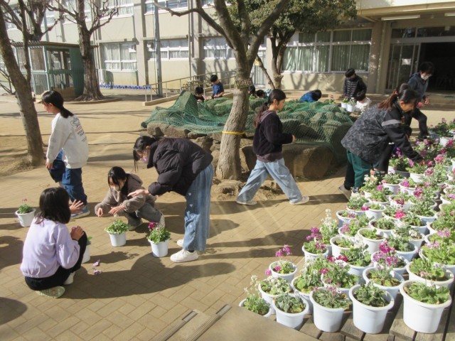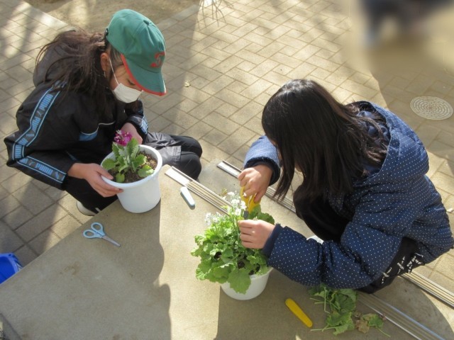 サクラソウの剪定作業をしている4年生です。黄色くなった葉や枯れかかっている葉を取り除いて、花が長く元気に咲き続けられるようにしていきます。