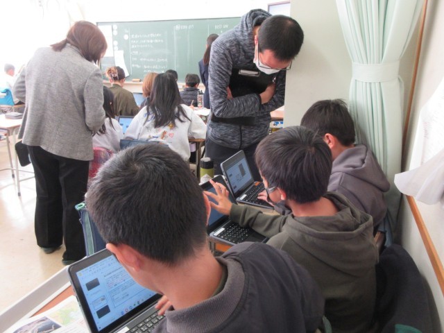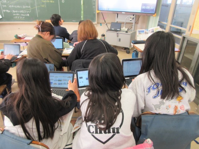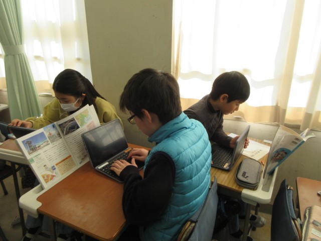 暮らしを守るために、誰が、どのような取組を進めているのか、資料から読み取っていきます。避難タワー、避難ビル、ハザードマップ、住宅地のかさ上げなどのキーワードを用いて、Chromebookにまとめています。個人作業の場面では、主体的に学習に取り組む姿勢が多く見られました。