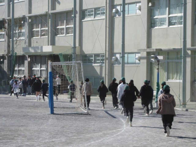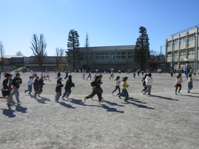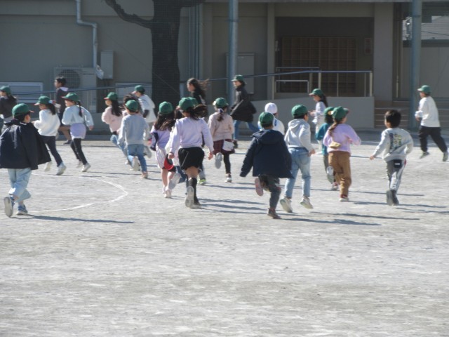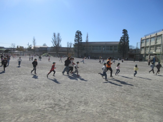 あたたかい日差しの中、先生たちも一緒に走っています。あいキッズの先生も飛び入り参加です。見学していた2年生が、あいキッズの先生を愛称で呼びかけて、嬉しそうに応援していました。