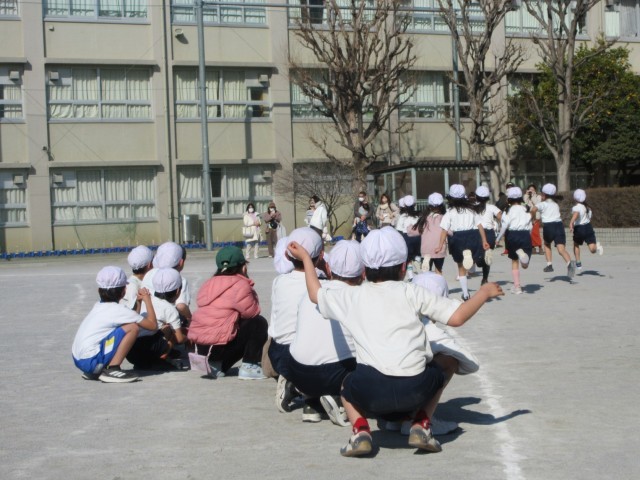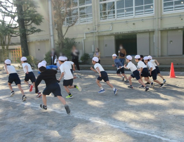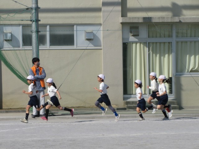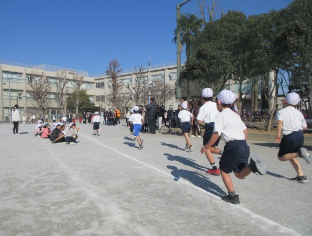 1・2年生は、5分間走ります。短距離走のように、飛び出して行く低学年です。そして、応援の声も元気な低学年です。