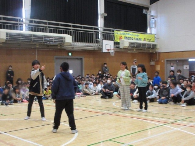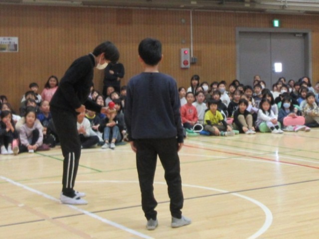 5年生は、6年生と真剣勝負です。暗算、けん玉、あっち向いてホイ…。暗算はどちらも正解でしたが、けん玉とあっち向いてホイは、6年生の勝利。さすが6年生!と体育館中が盛り上がりました。