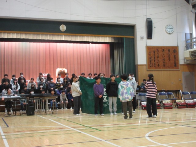 6年生は、「千本桜」の合奏と家庭科で作った雑巾のプレゼントでお礼をしました。また、6年生から4・5年生には校旗の引き継ぎがあり、下級生にバトンをつないでいく思い、しっかりと思いを受け継いだ下級生の決意も感じられました。