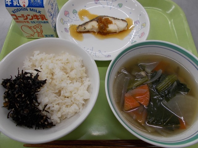 今日の汁物には “根菜”という土の中で育った野菜がたくさんはいっています。土の中で育つ野菜は“食物繊維”という、からだのなかにある、悪いものを外に出してくれる栄養がたくさん入っています。
