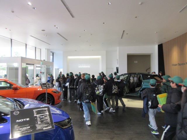 朝早い7時集合で、社会科見学に出発です。季節外れの雪が舞う中、午前中は日産追浜工場に向かいました。