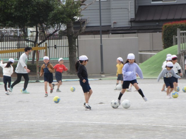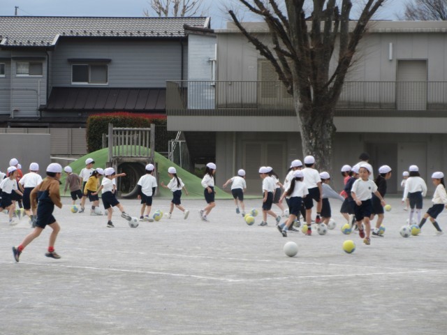 1年2組と3組の「ボール蹴りゲーム」の学習です。1人1個のボールを太鼓のリズムに合わせて、蹴って前に送ったり、止めたりしています。ルールの中で、伸び伸びと活動している姿に、成長を感じました。(写真1、2枚目)