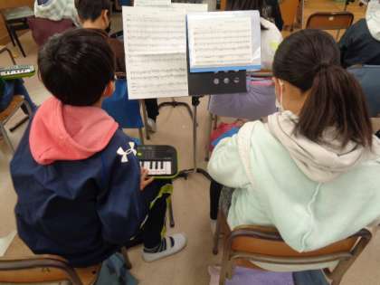 1組が演奏する曲は「アリ王子のお通り」です。軽快なリズムと独特な音階が光る曲です。担当楽器はこれから決めるので、まずは大部分の子供たちが担当するキーボードパートに取り組んでいました。絶賛譜読み中です。(写真下)