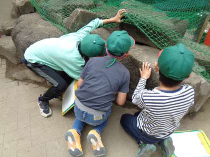 4年2組は、理科の学習で、春の動植物を観察しています。池の大きな石の下に「カエル」がいる、と子供たちが見付けていました。冬眠から覚めてきたのでしょうか・・・。