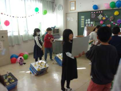 3年2組「3年2組!ハッピーランド」わなげと金魚すくいです。水色のスズランテープを水に見立てていました。