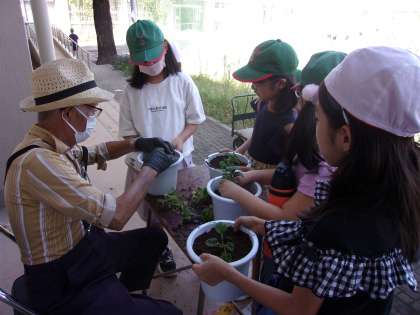 4年生はサクラソウの植え替えを行いました。毎年お世話になっている元PTA会長さんに、丁寧にご指導いただきました。