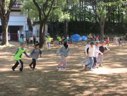 3クラス混合で学年を10グループに分け、あまり話したことがない友達とも、手をつないで協力をしながらペアまたはトリオを作りました。個人戦ではなく、チーム戦にしたことが、友達との仲を深めることにつながっています。子供たちが計画したことが、しっかり実践できて良かったですね。