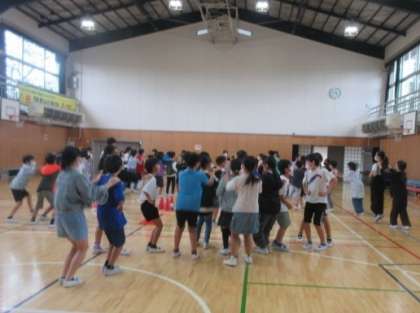 写真は、「猛獣狩りゲーム」「マイムマイム」「ジェンカ」の様子です。フォークダンスは、手をつないだり、友達の肩につながったり、中央に集まったりと、曲によって子供たちの嬉しくなるポイントがあります。そこでは"キタ━(゜∀゜)━!"と、スイッチが入ったように、笑顔いっぱいになります。本番が楽しみですね。