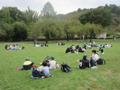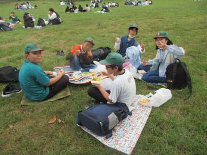 曇ったり、日が照ったりしていましたが、雨は降らなかったので広場で昼食です。行動班ごとに、お弁当をいただきました。