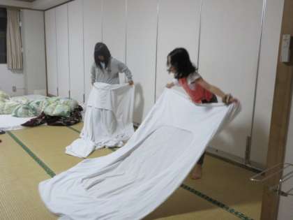 6:00に起床して、身支度を整えます。準備の早い班は、シーツや掛け布団カバーを友達と協力しながらたたんでいます。