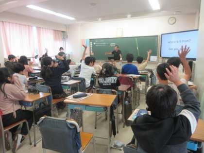 6年2組の外国語「身のまわりの物の生産国について、英語で言えるようになろう」では、自分が調べた物の産地について、一人一人が前に出て英語で質問をしていました。クイズのように、子供たちが積極的に答えていました。