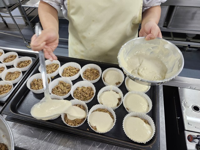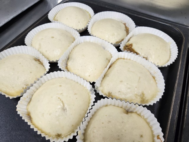 今日の給食の「肉まん風蒸しパン」は、給食室で手作りしました。ぶたひき肉、ねぎを炒めて、味付けした具の上に、小麦粉、ベーキングパウダー、砂糖で作った生地を流し入れて、蒸して作りました。