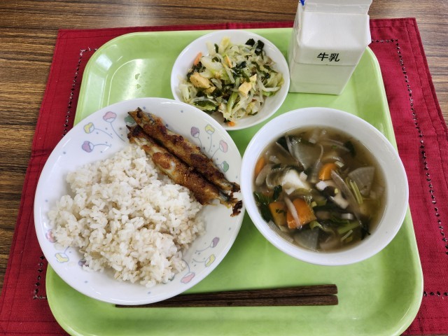 「ししゃものみそマヨネーズ焼き」は、新メニューです。魚の献立が人気の志六小ですが、ししゃもだけは『少し苦手』という児童が多いようです。ししゃもは、丸ごと食べられる分、内臓の苦みが少々感じられます。そこで、みそマヨネーズをぬってオーブンで焼き、苦みをやわらげた新しい味に仕上げました。