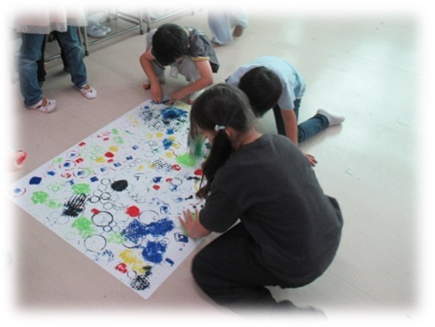 1年生が、図画工作科の学習で「スタンプぺったん」を行いました。トイレットペーパーの芯や洗濯ばさみなど、身近な物をスタンプに使って模造紙にぺったん!丸やお花の形など、押すたびにいろいろな模様が広がっていきました。グループの友達と相談しながら、模様をつなげたり重ねたりして、みんなで大きな作品を作り上げました。「こんな形になったね!」「次はここに押そう!」と笑顔あふれる時間になりました。