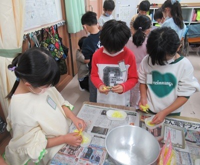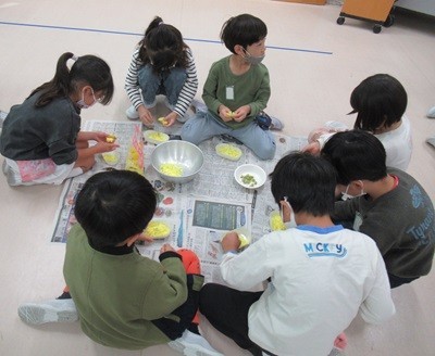 また、この菊花あえを作るお手伝いとして1年1組から4組の子どもたちが花びらつみを行いました。