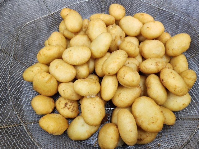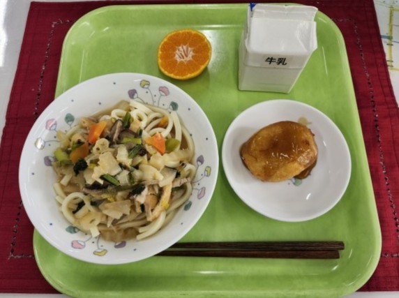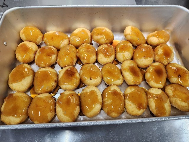 蒸したじゃがいもをよく潰し、片栗粉・砂糖・塩・バターを加えて練り合わせ、丸めて油で揚げます。仕上げに、みたらしダレをかけました。調理員さんたちが時間をかけて丁寧に練り合わせたことで、まん丸のいももちが出来上がりました。