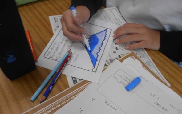 台湾のErchong Elementary Schoolとのオンライン交流後に、お手紙が届きました。自己紹介の内容や日本の食べ物とアニメのイラストがあり、6年生は一生懸命読んでいました。手紙の中には日本語で好きなアニメやマンガのタイトルが書かれているものもあり、「知ってる!」「すごい!」などと驚いていました。6年生も、好きなことや教科などを紹介する自己紹介のお手紙を書きました。想いを込めて丁寧に英文を書き、色ぬりしていました。オンライン交流の感想やお礼を書いている子もいました。今後も良い交流が続くとうれしいです。