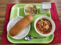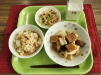 今日の給食は野菜をたくさん食べられるメニューです。中華丼にはたけのこや白菜、チンゲンサイ、玉ねぎなどたくさんの野菜と、えびやいかが使われています。