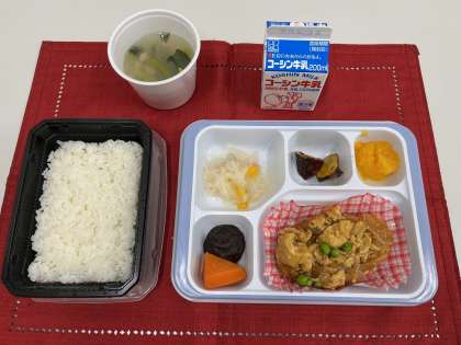 牛乳、ごはん、親子カツ煮、ハムマリネ、炊き合わせ、大学芋、みそ汁、くだもの(みかん缶)