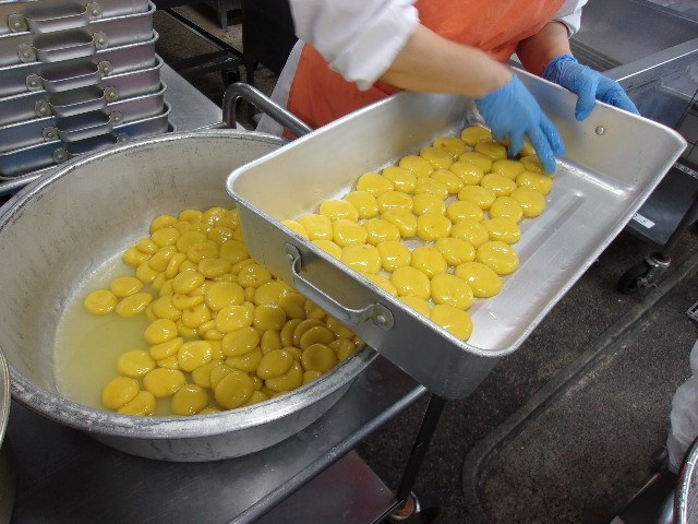きれいに形を作ったら、大きな釜でゆでます。