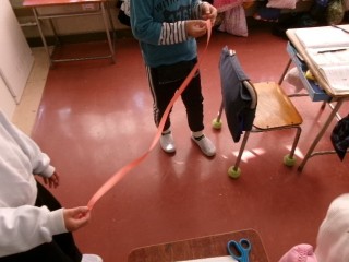 また、紙テープを使って、1mの長さがどれぐらいか予想して、実際にものさしで測りました。