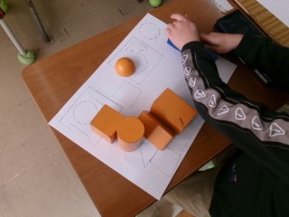算数では、いろいろな立体図形の面を写し取り、その形をもとに絵をかきました。