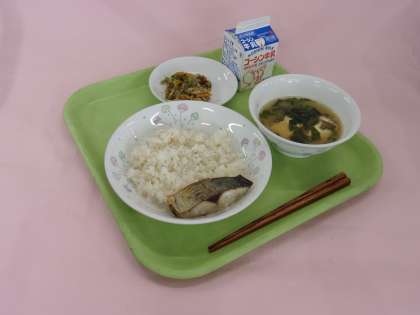 みそ汁の具は、生揚げ、玉ねぎ、わかめ、小松菜でした。生あげは薄く切ったので苦手な子どもたちも食べやすかったようです。給食では、油揚げや生揚げなどを入れたコクのあるみそ汁のほうが、あっさりとした野菜だけのみそ汁より人気があります。