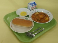 左の写真は、揚げパンにまぶす砂糖をふるいにかけているところです。