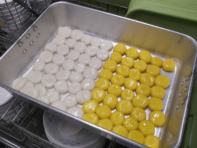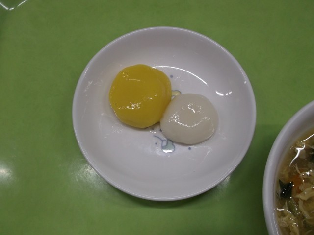 10月6日は十五夜ということで、今日の給食は「お月見の行事食」です。白と黄色の2色のお団子を、給食室でひとつひとつ手作りしました。黄色いお団子には、かぼちゃのペーストが練り込まれています。子どもたちも「黄色は何の色だろう?」「白と黄色どっちが好き?」と楽しんで食べていました。