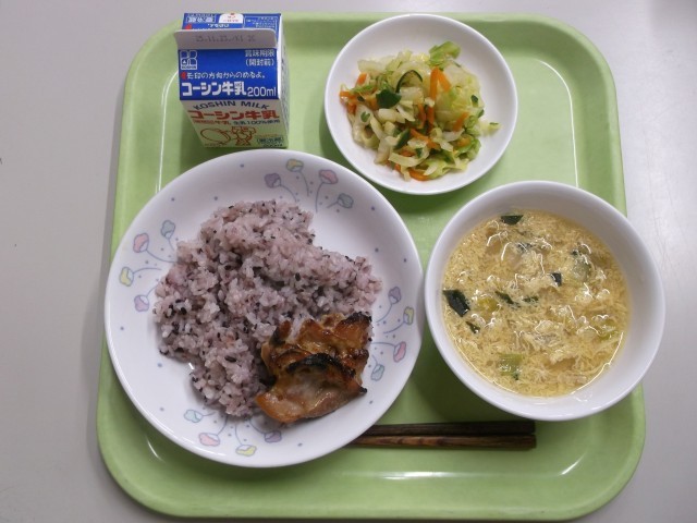 今日は、七五三の行事食で、赤飯を炊きました。いつもの赤飯と違い、あずきは入っていません。「黒米」を入れることで、きれいな色に炊き上がりました。豆が苦手な児童もよく食べていました。