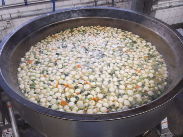 3学期の給食が始まりました。初日の献立は、鏡開きにちなんで「白玉汁」です。白玉粉と豆腐で作った特製白玉を、すまし汁に入れました。その数なんと、2000個!給食室で愛情を込めて手作りしました。お餅よりやわらかく、安全に食べることができました。