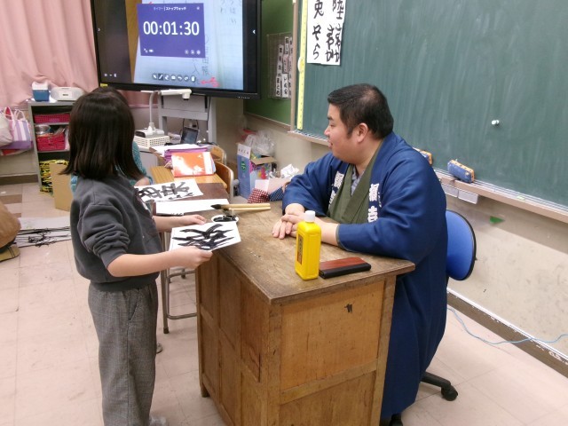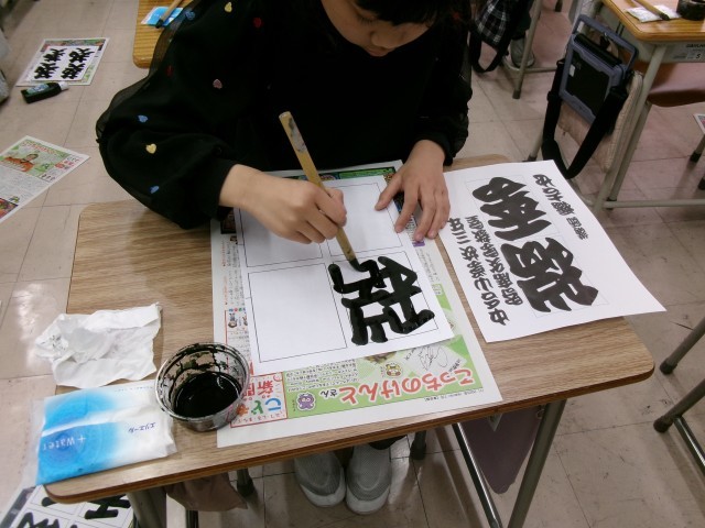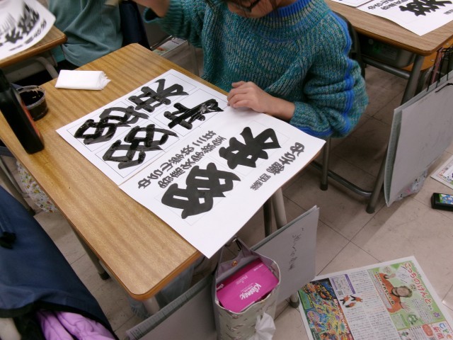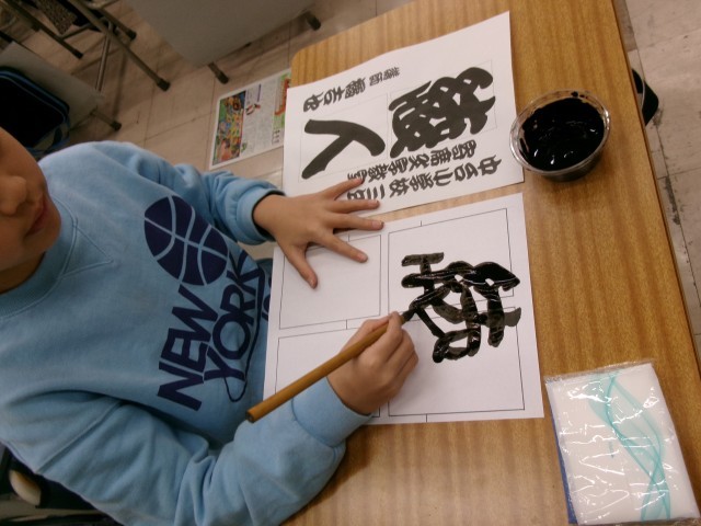 3年生が、今年も「寄席文字」に挑戦しました。自分の名前を書きながら「弟子になるぞ!」と頑張っていました。さて、最後の文字は何という文字でしょう?また、何画あるのかわかりますか?