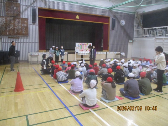 2月3日、節分の日に、5組は1年1・2組さんと節分交流集会をしました。まめまきの歌や節分にまつわるクイズ、デカパンリレーをして楽しく交流しました。