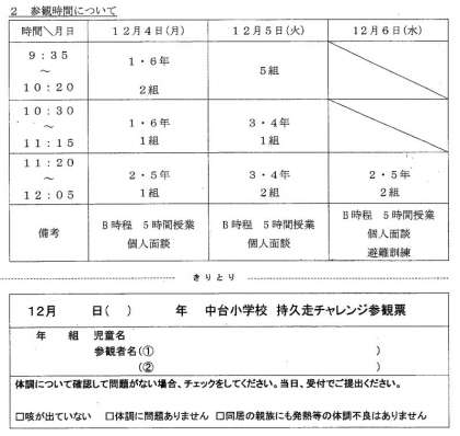 持久走チャレンジを12月4日(月)〜6日(水)校庭で実施いたします。実施(参観)日時が学年学級によって異なります。子どもたちの取組を応援していただきたいと思います。