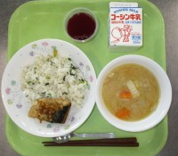 菜めし・鯖の生姜風味焼き・豆乳仕立ての野菜汁・ぶどうゼリー・牛乳 焼いた鯖に生姜...