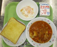 ジャージャン麵・のり塩フライドポテト・フルーツポンチ・牛乳
