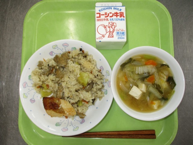 秋の彩りごはん・カレイの塩こうじ焼き・味噌汁・牛乳