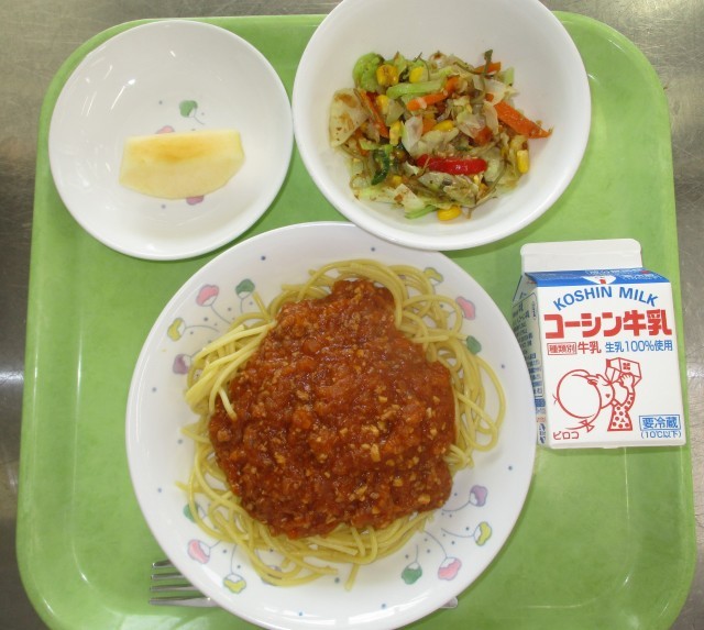 スパゲッティーミートソース・りっちゃんの元気サラダ・りんご・牛乳