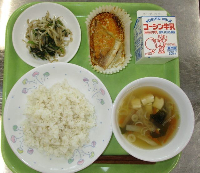 ごはん・赤魚のもみじ焼き・青菜ともやしのごま醬油・すまし汁・牛乳